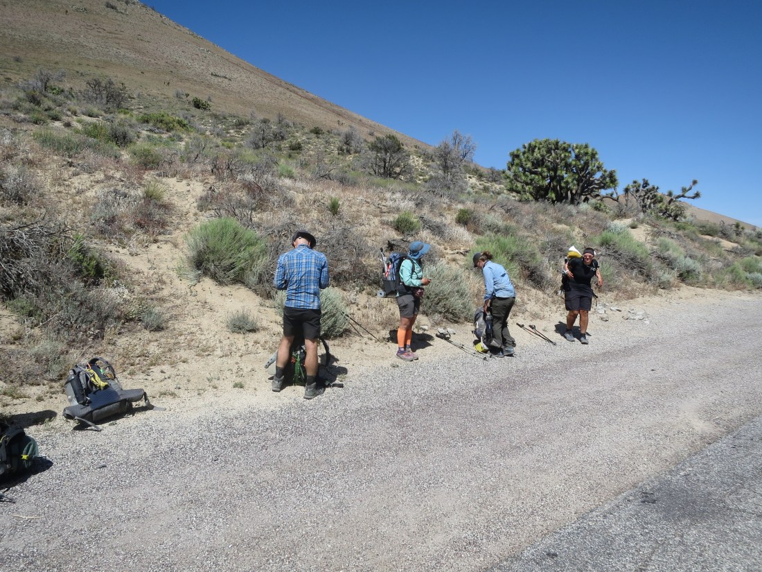 Lunch break at mile 622, combined with longer siesta. Limited shade, everyone tries to hide under a Joshua tree.